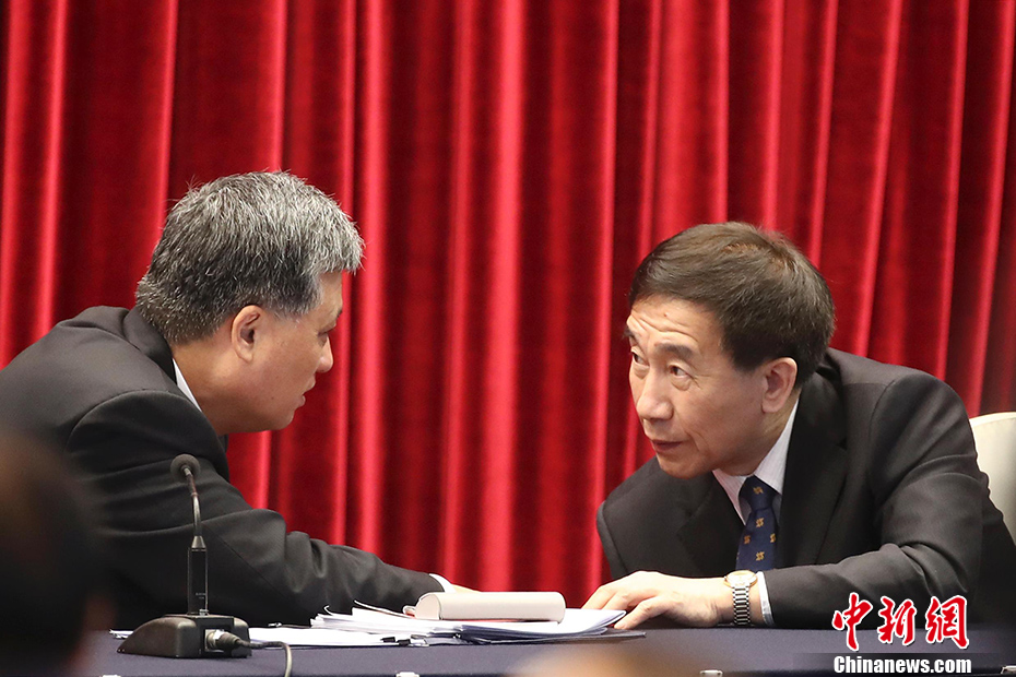 3月6日,十三届全国人大二次会议广东省代表团举行全体会议,审议李克强总理所作的政府工作报告,并向中外媒体开放。图为广东省省长马兴瑞(左)与全国人大宪法和法律委员会主任委员李飞(右)交谈。中新社记者 盛佳鹏 摄
