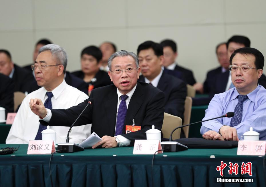 3月6日,十三届全国人大二次会议山东省代表团举行全体会议,审议李克强总理所作的政府工作报告,并向中外媒体开放。图为全国人大代表、山东省委书记刘家义主持会议。中新社记者 刘震 摄