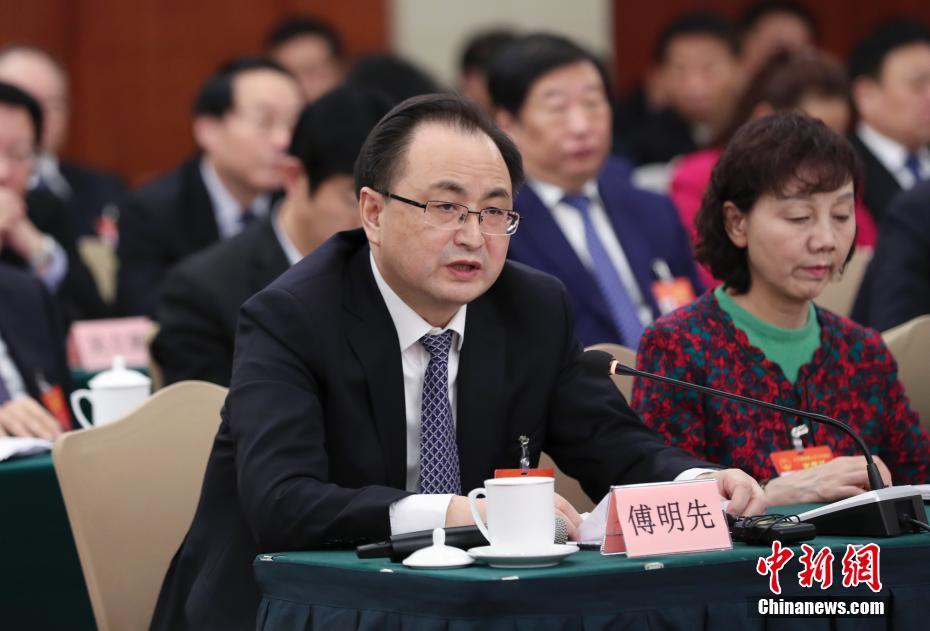3月6日,十三届全国人大二次会议山东省代表团举行全体会议,审议李克强总理所作的政府工作报告,并向中外媒体开放。图为全国人大代表、济宁市委书记傅明先发言。中新社记者 刘震 摄