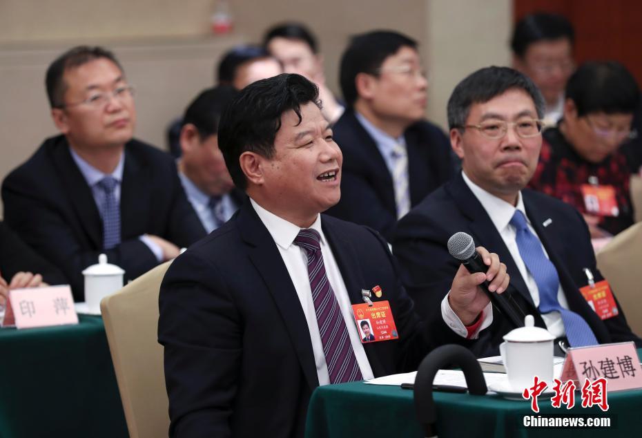 3月6日,十三届全国人大二次会议山东省代表团举行全体会议,审议李克强总理所作的政府工作报告,并向中外媒体开放。图为全国人大代表、全国“林业英雄”、淄博市原山林场党委书记孙建博回答记者提问。中新社记者 刘震 摄