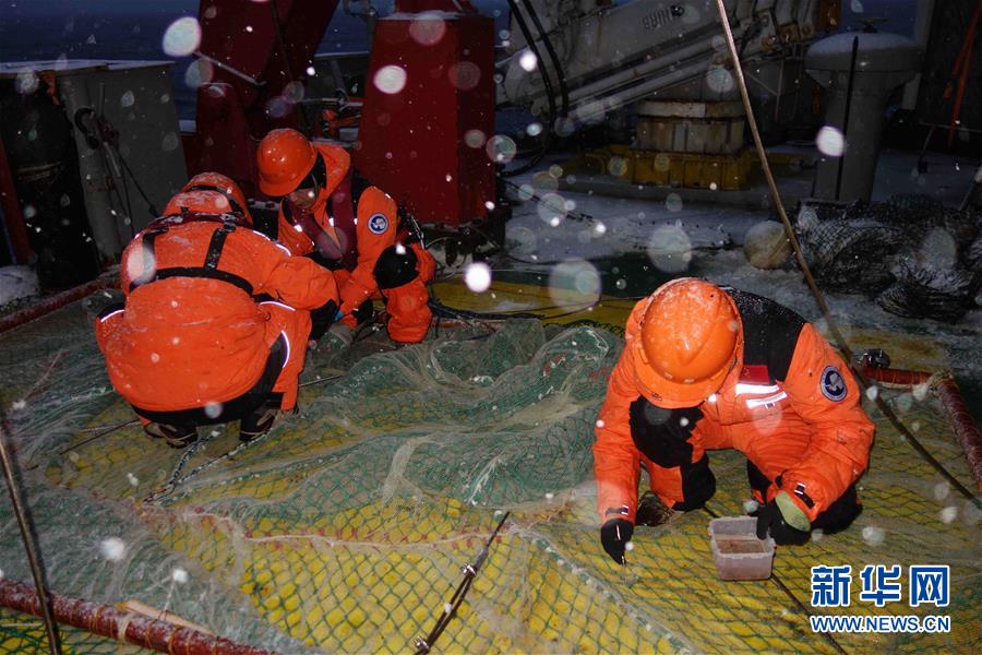 科考队员在雪中清理鳞虾样品(2019年1月16日摄)。新华社发(中国第35次南极科学考察队供图)
