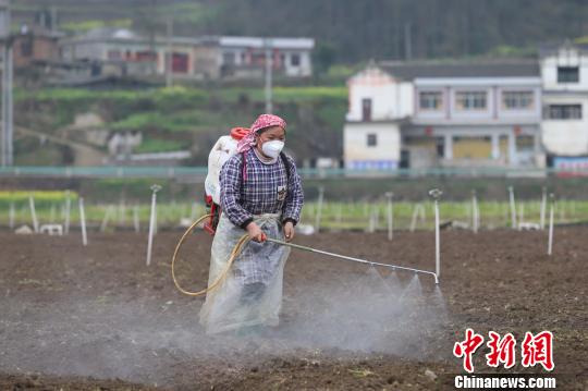 图为贵州织金上坪寨乡香葱基地一位村民在喷洒除草剂。 瞿宏伦 摄