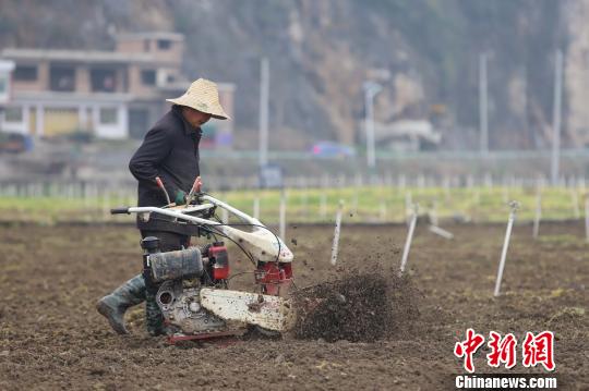 图为贵州织金上坪寨乡香葱基地一位村民在用旋耕机松土。 瞿宏伦 摄