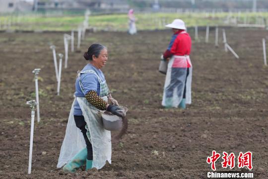 图为贵州织金上坪寨乡香葱基地两位村民在撒肥料。 瞿宏伦 摄