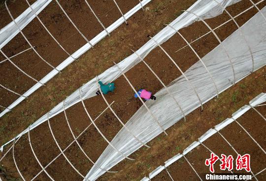 图为贵州丹寨兴仁镇西瓜种植基地瓜农在刚刚松好的土地上覆膜保水。 黄晓海 摄