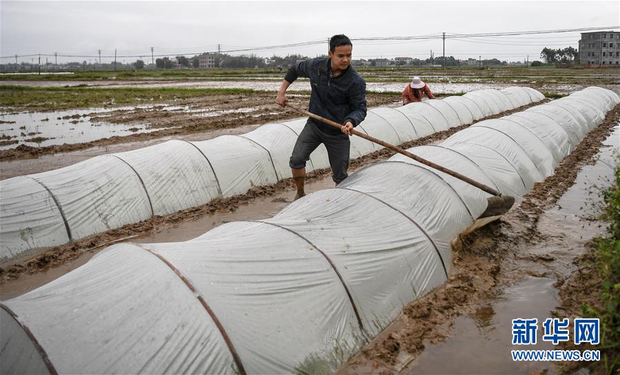 3月7日,广西钦州市康熙岭镇板坪村农民黄永成在护理秧苗拱棚。近日,广西钦州农民抓住“冷尾暖头”时机,翻耕秧田、撒种、盖膜、搭拱棚,开展早稻生产工作。新华社记者 张爱林 摄