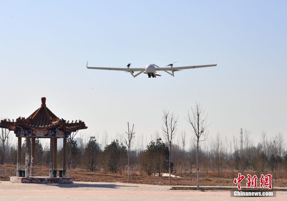 据了解,该超大无人机翼展约4米。2019年初,长安区城市管理综合行政执法局在全市率先启用无人机全域航拍技术,对全区138平方公里市容市貌进行航拍,通过高空“千里眼”消除城市管理死角。这一技术现阶段主要应用于露天垃圾和私搭乱建的整治。中新社记者 翟羽佳 摄