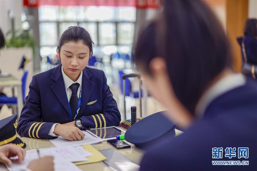 在重庆江北国际机场,飞行员杨静(左)和杜倩在进行机组的航前准备工作(3月6日摄)。