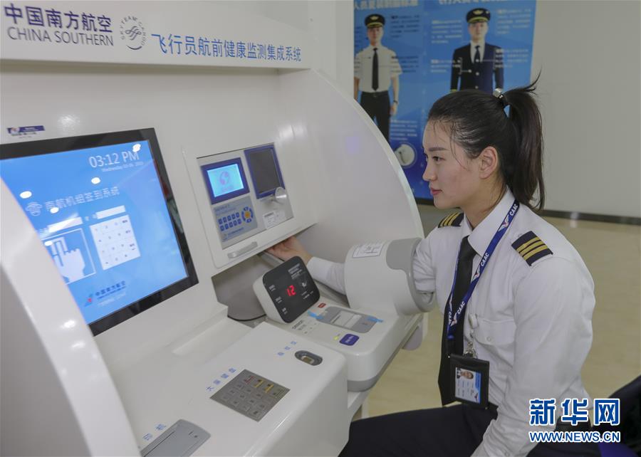 在重庆江北国际机场,飞行员杜倩在进行飞行员航前身体检查(3月6日摄)。 新华社记者 刘潺 摄