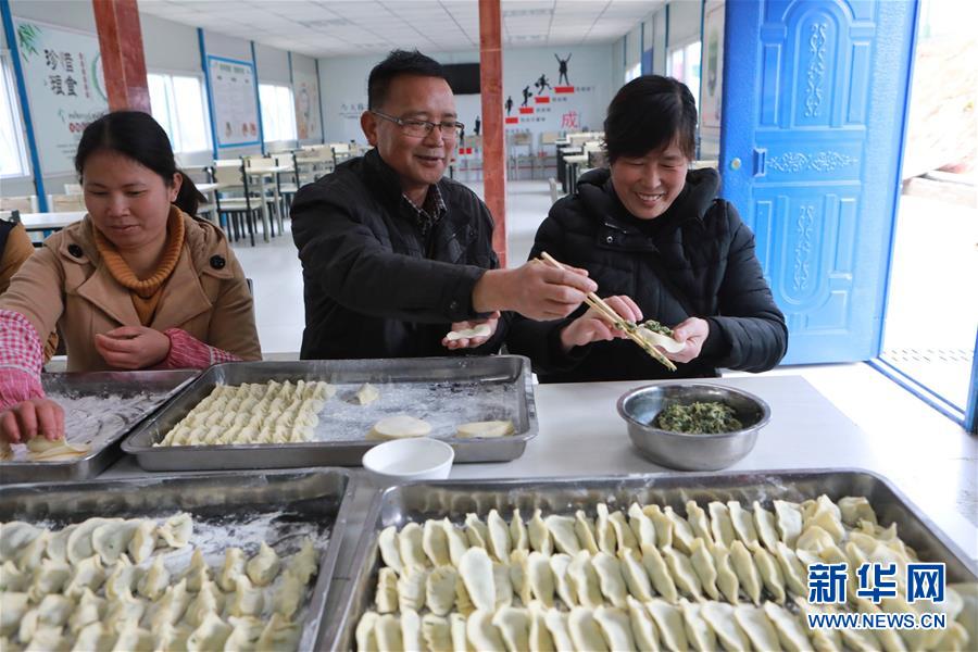3月8日,一名女工(右)和她的丈夫在工地上包饺子,庆祝节日。 新华社记者 欧东衢 摄