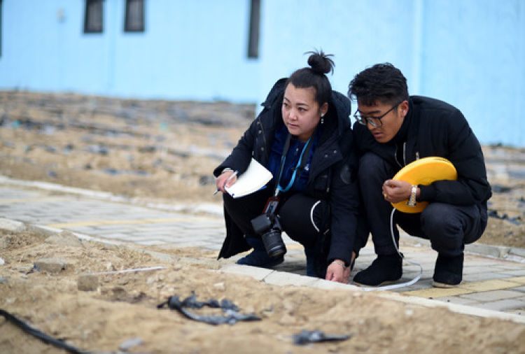 索朗央吉(左)与村干部测量房前屋后的地,准备种植玫瑰、牧草等(2018年3月6日摄)。索朗央吉在乡村工作已经16年了,基层工作尽管充满酸甜苦辣,但她始终不忘初心:“群众不脱贫,我就不离村!”新华社记者 觉果 摄
