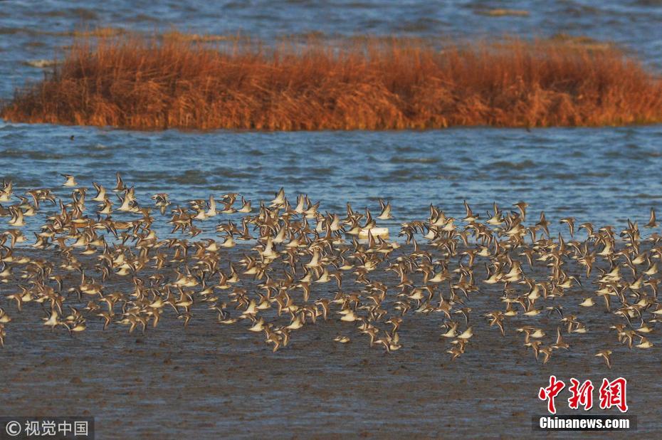 3月8日,山东青岛胶州湾国家级海洋公园进入候鸟迁徙时节,成群越冬和过境的鸻鹬类水鸟在滩涂上密集进食补充体能,场面壮观。王海滨 摄 图片来源:视觉中国
