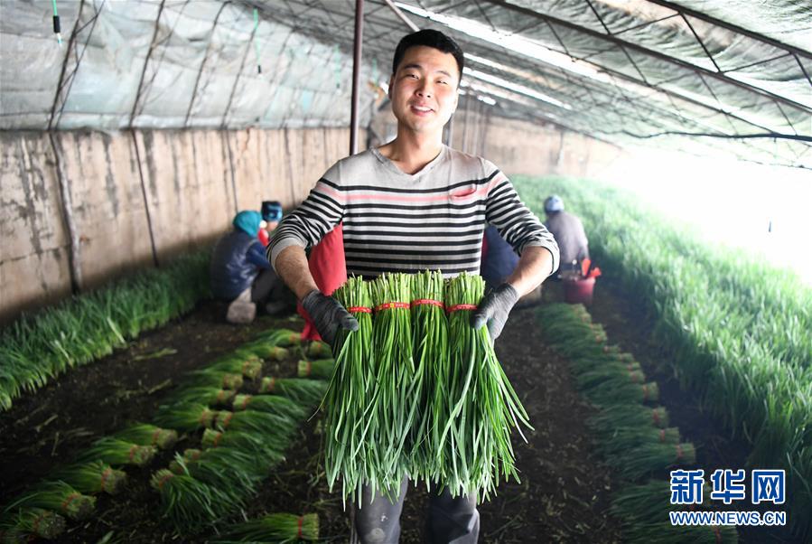 宁安市渤海镇双庙子村种植户王艳涛在自家大棚内展示刚收割的韭菜(3月6日摄)。新华社记者 王建威 摄