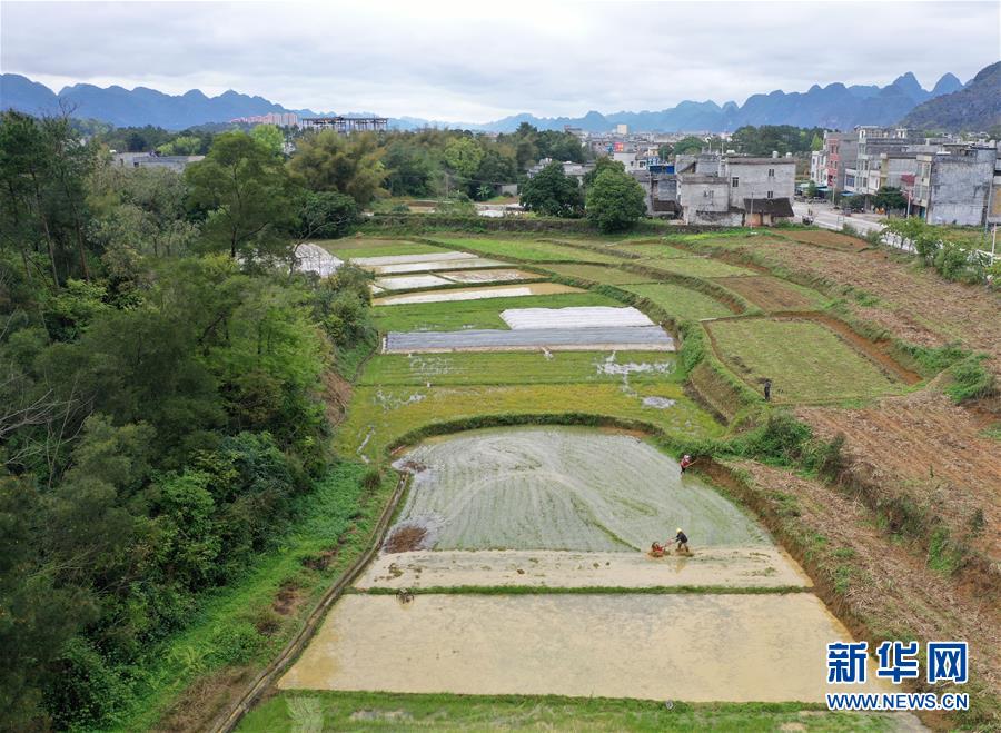 3月9日,在广西都安瑶族自治县澄江镇境内,村民在田间春耕(无人机拍摄)。 新华社记者 陆波岸 摄