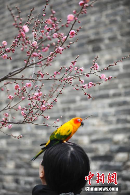 3月9日,民众遛鸟赏花。当日,北京明城墙遗址公园第十二届梅花文化节开幕,多姿梅花已竞相绽放,不少市民前来赏花拍照享春意时光。中新社记者 赵隽 摄