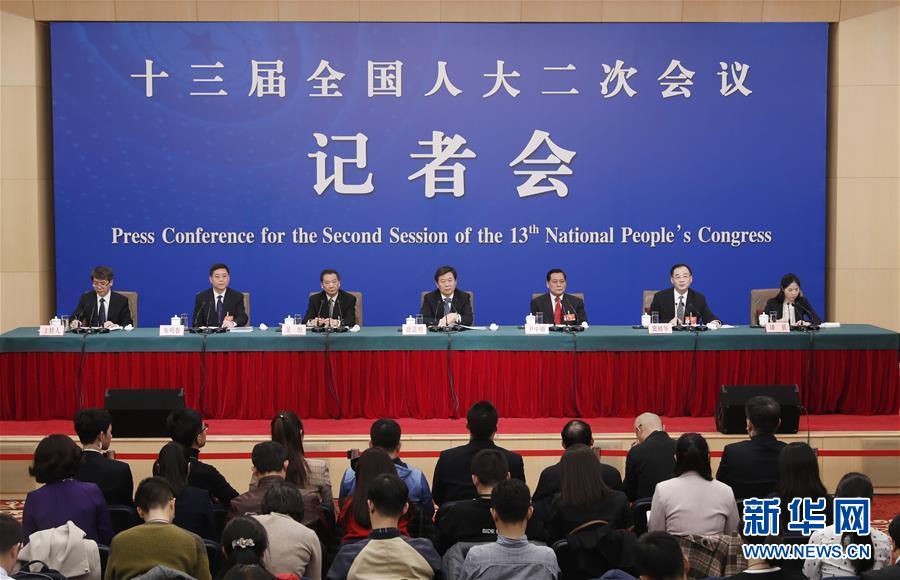 3月10日,十三届全国人大二次会议新闻中心举行记者会,邀请全国人大监察和司法委员会副主任委员徐显明、全国人大财政经济委员会副主任委员尹中卿、全国人大教育科学文化卫生委员会副主任委员吴恒、全国人大环境与资源保护委员会副主任委员窦树华和全国人大常委会预算工作委员会副主任朱明春就“人大监督工作”相关问题回答中外记者提问。 新华社记者 沈伯韩 摄