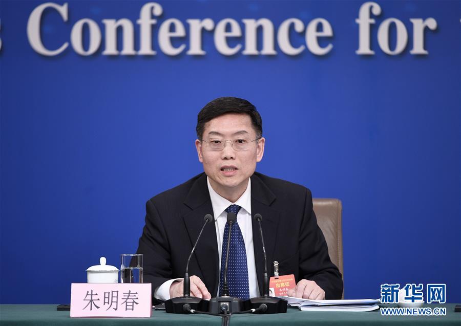 3月10日,十三届全国人大二次会议新闻中心举行记者会,邀请全国人大监察和司法委员会副主任委员徐显明、全国人大财政经济委员会副主任委员尹中卿、全国人大教育科学文化卫生委员会副主任委员吴恒、全国人大环境与资源保护委员会副主任委员窦树华和全国人大常委会预算工作委员会副主任朱明春就“人大监督工作”相关问题回答中外记者提问。这是朱明春在回答记者提问。 新华社记者 王鹏 摄