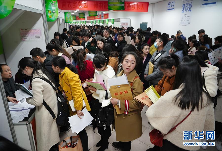 3月10日,求职者在招聘会现场排队应聘。 当日,2019年陕西省县及县以下医疗卫生机构定向招聘医学类本科毕业生招聘会在西安举行。招聘现场提供就业岗位2441个,定向招聘人员除纳入事业单位编制内管理外,还将在工资、保障性住房、晋升等方面按规定给予相关倾斜和优先政策,吸引大量医学毕业生前来应聘。3 新华社记者 邵瑞 摄