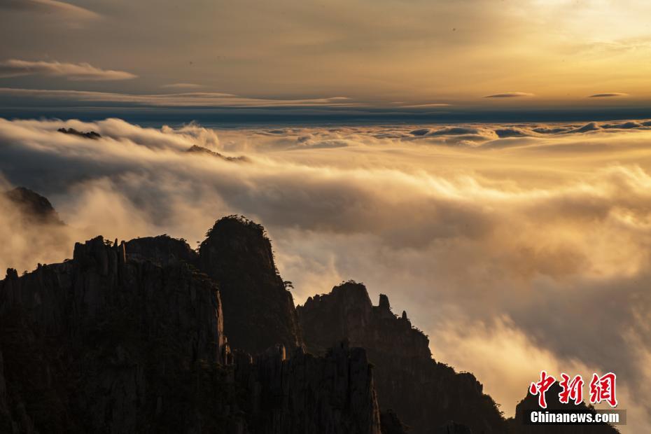 3月9日傍晚,安徽黄山风景区日落时分,现大面积云海景观,夕阳余晖铺洒在云海之上,光辉万丈,移步换景,每个角度都是一副绝妙的山水图画。黄山云海翻涌,群山万壑淹没在雾浪之中。文/图刘浩 叶永清