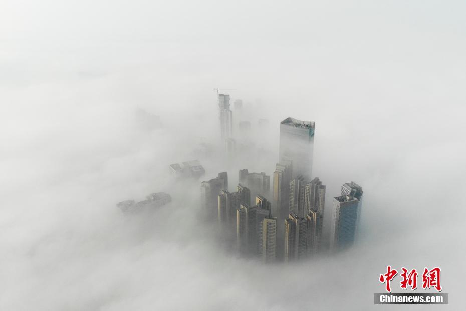 3月10日,湖南长沙遭遇大雾锁城,建筑物穿雾而出犹如仙境。当日上午,长沙气象台连发三条大雾预警信号,长沙市出现最低能见度不足200米的大雾。 杨华峰 摄