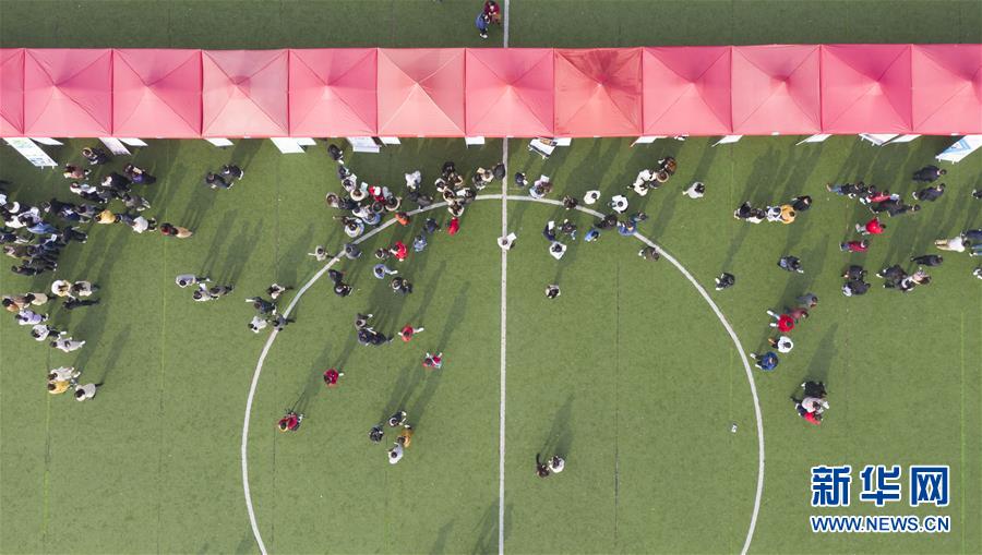 这是江西工程学院2019届毕业生专场人才招聘会现场(3月10日无人机拍摄)。 当日,江西工程学院2019届毕业生专场人才招聘会在位于江西省新余市的天工校区举行,共160多家用人单位提供4000多个岗位,吸引学生前来应聘。 新华社发(赵春亮 摄)