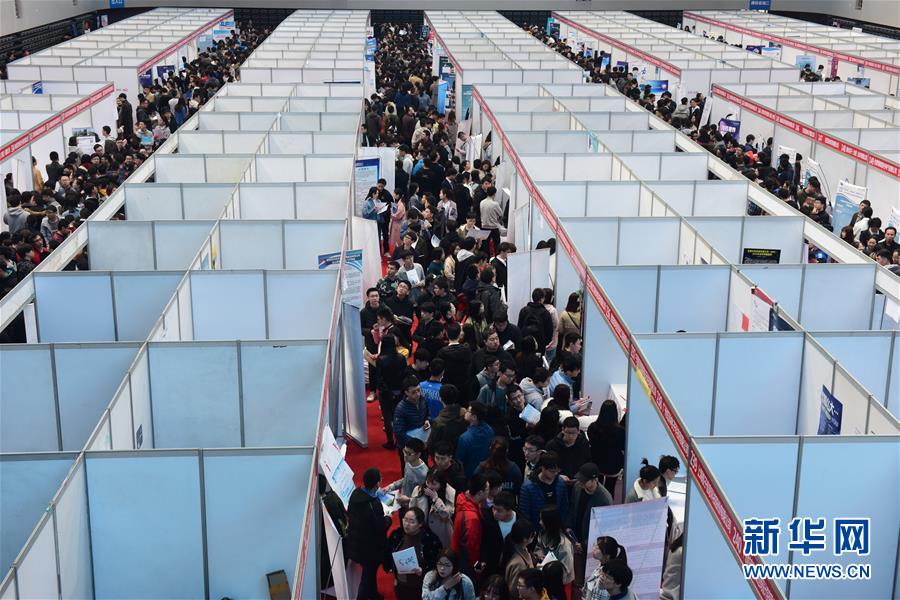 这是西安电子科技大学2019年春季“双向选择”洽谈会现场(3月10日摄)。 当日,西安电子科技大学2019年春季“双向选择”洽谈会在南校区举行,共600多家用人单位提供近2万个岗位,吸引学生入场应聘。 新华社发(袁景智 摄)