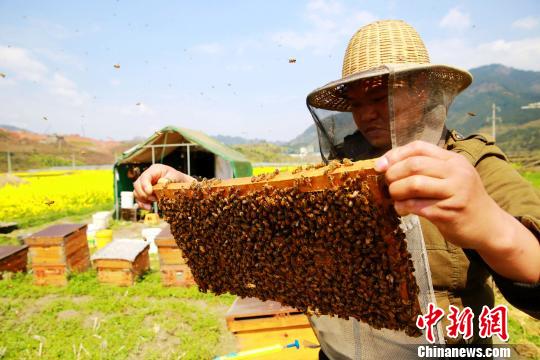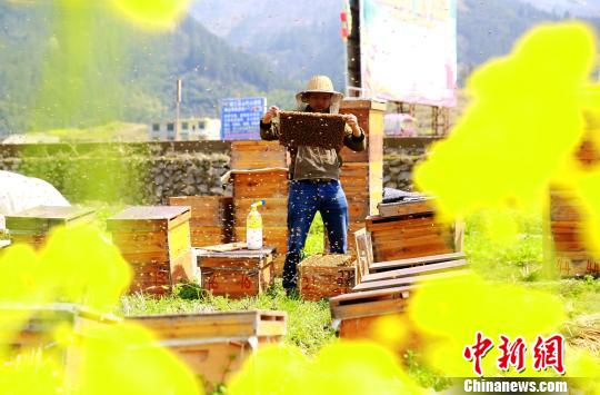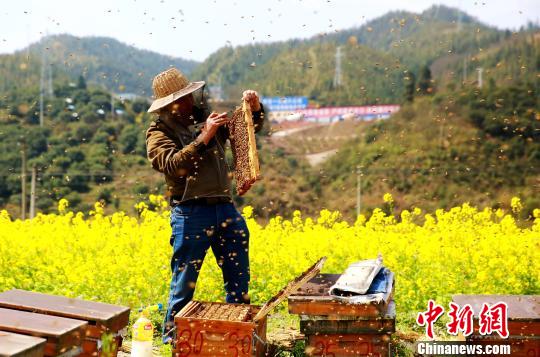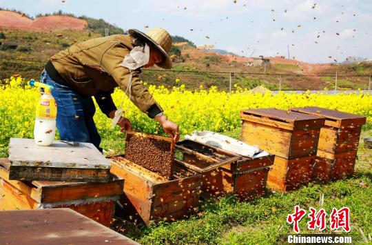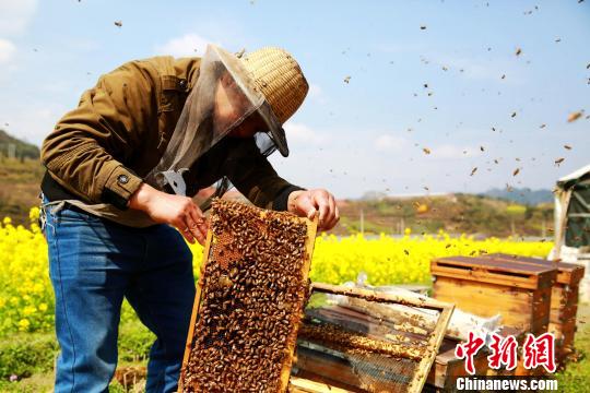 3月10日,贵州省黔东南苗族侗族自治州榕江县天气晴朗,盛开的油菜给蜜蜂采蜜提供良好条件,蜂农忙于采集蜂蜜。