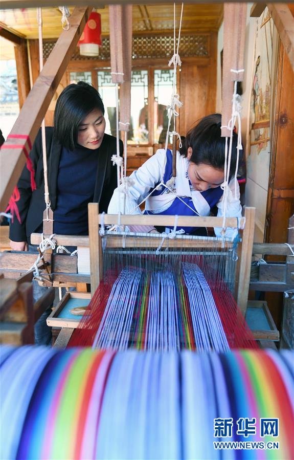 2月13日,范永贞(左)在云南丽江古城调研纳西族民间纺织工艺。新华社记者 杨宗友 摄