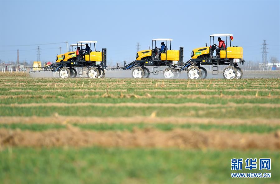 3月11日,在河北省石家庄市藁城区梅花镇的农田里,农民驾驶农机在小麦田间劳作。 随着天气回暖,人们纷纷投入到忙碌的生产劳动中。 新华社发(张晓峰 摄)