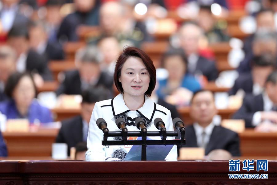3月11日,全国政协十三届二次会议在北京人民大会堂举行第四次全体会议。这是李慧琼委员作大会发言。 新华社记者 丁海涛 摄