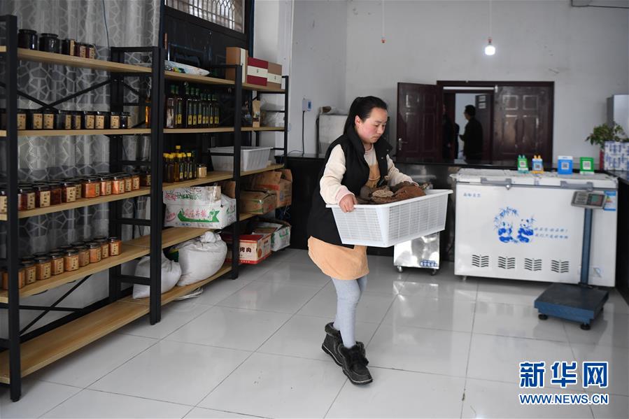 3月11日,在洛塔乡电子商务服务中心,吴添春将灵芝从货架上搬下准备打包。 新华社记者 薛宇舸 摄
