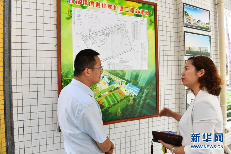 2月20日,米雪梅(右)在中山市沙溪镇虎逊小学调研时与校长黄金奇交谈。全国人大代表米雪梅在广东省中山市工作。她从老家甘肃来到中山,打拼了20多年,曾做过保安、车间统计员、厂长助理、品质主管、客服部经理,现在担任一家企业的客服部总监。作为全国人大代表,米雪梅提出了关于外来务工人员子女教育问题的建议,她希望加大对教育的投入,让更多外来务工人员子女在城市中享受到公平而有质量的教育。 新华社记者 刘大伟 摄