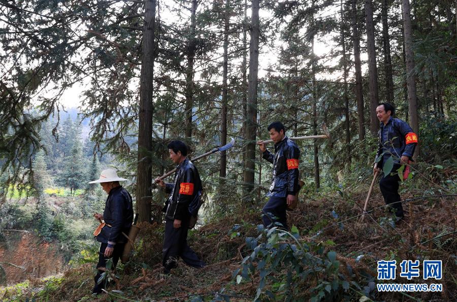 吴庆贤(左一)与护林员在巡护森林(3月11日摄)。 今年75岁的侗族老人吴庆贤,是贵州省黔东南苗族侗族自治州黎平县双江镇四寨村的村民。1984年之前,吴庆贤看村子周围都是茅草坡,一片荒凉,于是自己出资,远赴湖南等地购进杉树种和树苗,请人在村子周围的荒山上陆续种上杉树。 35年来,随着当年种植的树木慢慢长大,吴庆贤也变成了白发苍苍的老人,他亲眼看着侗寨周围的山头逐渐变绿、河水变清、树木成林,深感欣慰。吴庆贤把自己带头种植的6000余亩树林交给村集体,并带动邻近村寨的乡亲们植树造林5万余亩。 新华社发(杨代富摄)