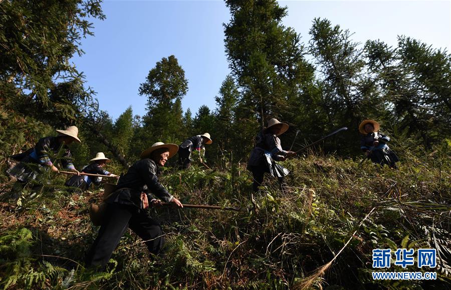 吴庆贤(前)与乡亲们在林区清除杂草(3月11日摄)。 今年75岁的侗族老人吴庆贤,是贵州省黔东南苗族侗族自治州黎平县双江镇四寨村的村民。1984年之前,吴庆贤看村子周围都是茅草坡,一片荒凉,于是自己出资,远赴湖南等地购进杉树种和树苗,请人在村子周围的荒山上陆续种上杉树。 35年来,随着当年种植的树木慢慢长大,吴庆贤也变成了白发苍苍的老人,他亲眼看着侗寨周围的山头逐渐变绿、河水变清、树木成林,深感欣慰。吴庆贤把自己带头种植的6000余亩树林交给村集体,并带动邻近村寨的乡亲们植树造林5万余亩。 新华社记者 杨文斌 摄