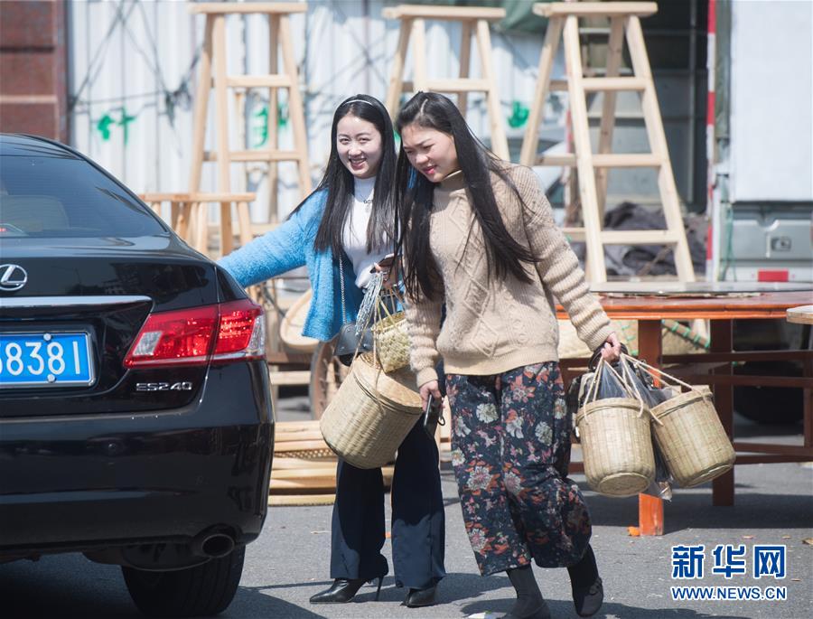 3月12日,两位女士在福建武夷山“柴头会”上采购后准备乘车离开。 新华社记者 宋为伟 摄