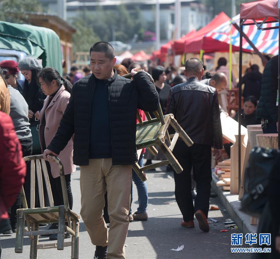 3月12日,一位男子在福建武夷山“柴头会”上挑选竹凳。 新华社发(陈颖摄)