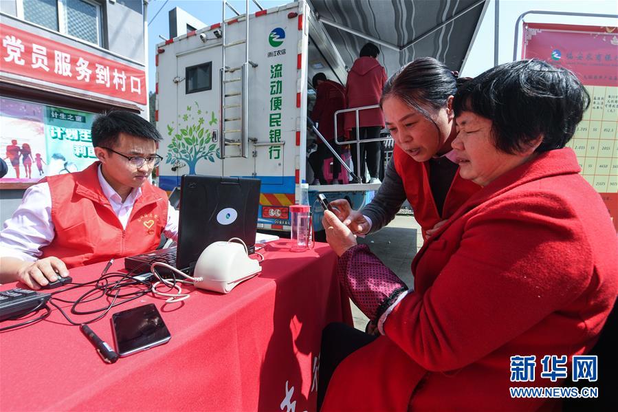3月12日,党员志愿者在太阳镇上太阳村指导当地村民办理手机银行。 新华社记者 徐昱 摄
