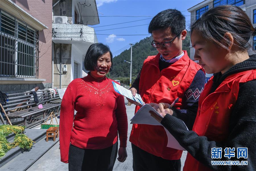 3月12日,党员志愿者为太阳镇上太阳村一名行动不便的村民上门登记信息,为她办理公交优惠卡。 新华社记者 徐昱 摄