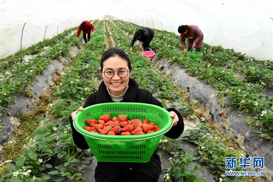2018年2月27日,王萌萌展示刚采摘的草莓。全国人大代表王萌萌是安徽省定远县西孔村一名大学生“村官”,她带领村民建立起草莓园、蔬菜园、育秧工厂等特色项目,吸引游客前来采摘,村民的日子越过越红火。 新华社发(冯再雷 摄)