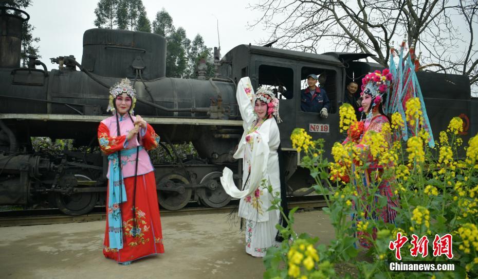 3月12日,身着汉服的游客在窄轨边游览。阳春三月,在花海中穿行的四川省犍为县嘉阳小火车迎来旅游旺季,海内外众多游客慕名前来乘坐这列开往春天的“小火车”。嘉阳小火车是目前世界上为数不多的还在正常运行的客运窄轨蒸汽小火车,保留了蒸汽时代的加煤、制动、扳道等手动操作方式。中新社记者 刘忠俊 摄
