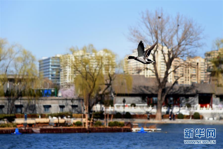 3月12日,野鸭在什刹海西海水面上飞翔。 当日,“绿色北京 绿色行动”宣讲团专家走进北京西城区什刹海街道办事处,就什刹海区域环境保护工作展开研讨。 据了解,什刹海区域2018年启动建设西海湿地公园,在保护什刹海地区水环境的同时,为市民休闲提供好去处。 新华社发(任超 摄)