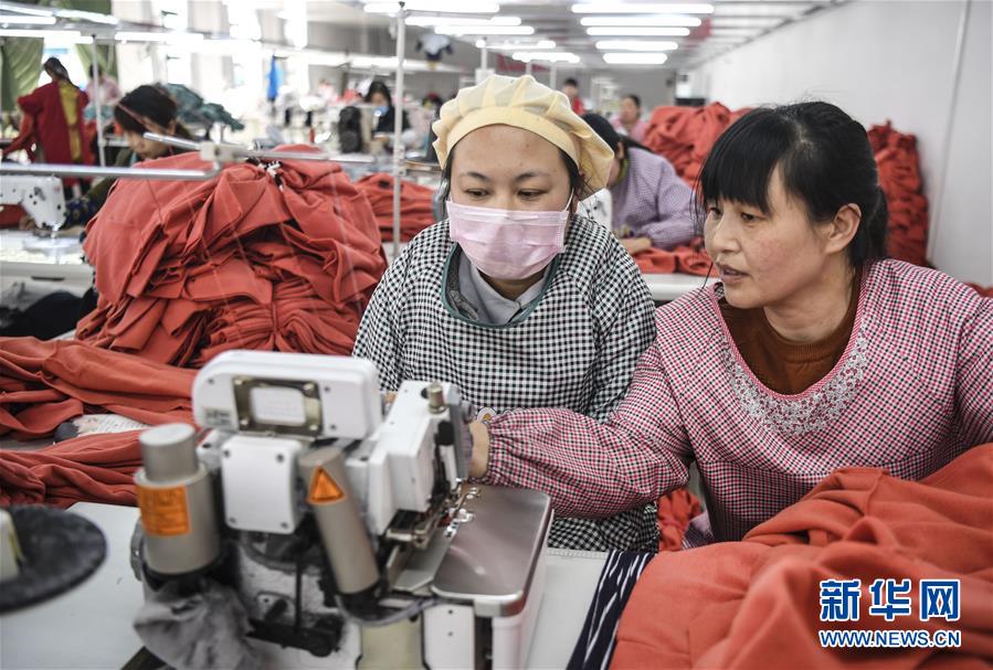 3月12日,洋县李家村移民搬迁集中安置点社区工厂——洋县绅宝利服饰公司加工班组组长彭旭侠(右)在向新员工传授缝纫技术。该公司吸纳了200余社区居民就业。 新华社记者 陶明 摄