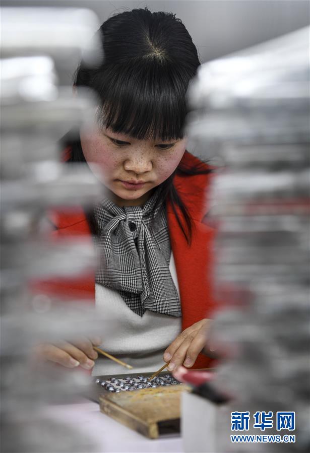 3月12日,洋县李家村移民搬迁集中安置点社区工厂——汉中胜达电子科技有限公司员工在生产线上粘合电路板。新华社记者 陶明 摄