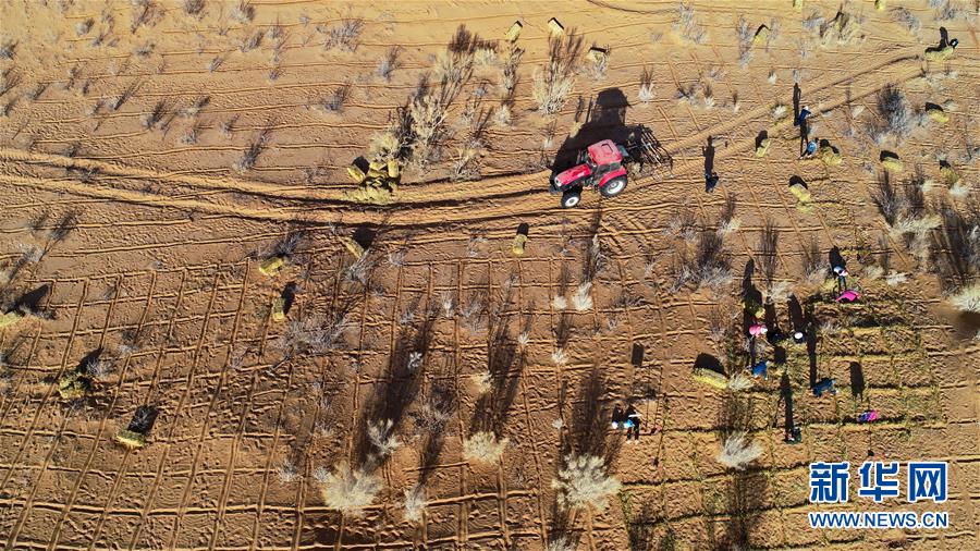 3月12日,人们在荒漠中用麦草制作阻沙网(无人机拍摄)。 当日,甘肃省临泽县组织干部群众来到北部干旱荒漠区,开展大规模防沙治沙行动。临泽县位于巴丹吉林沙漠边缘,近年来不断加大防沙治沙力度。目前,已建成防风固沙林27.4万亩,阻沙林带189公里。 新华社发(王将 摄)