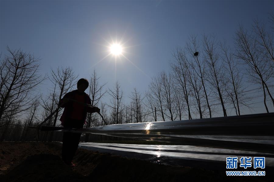 3月13日,山东省临沂市郯城县郯城街道的农民在为刚播种的土豆覆膜。新华社发(张春雷 摄)