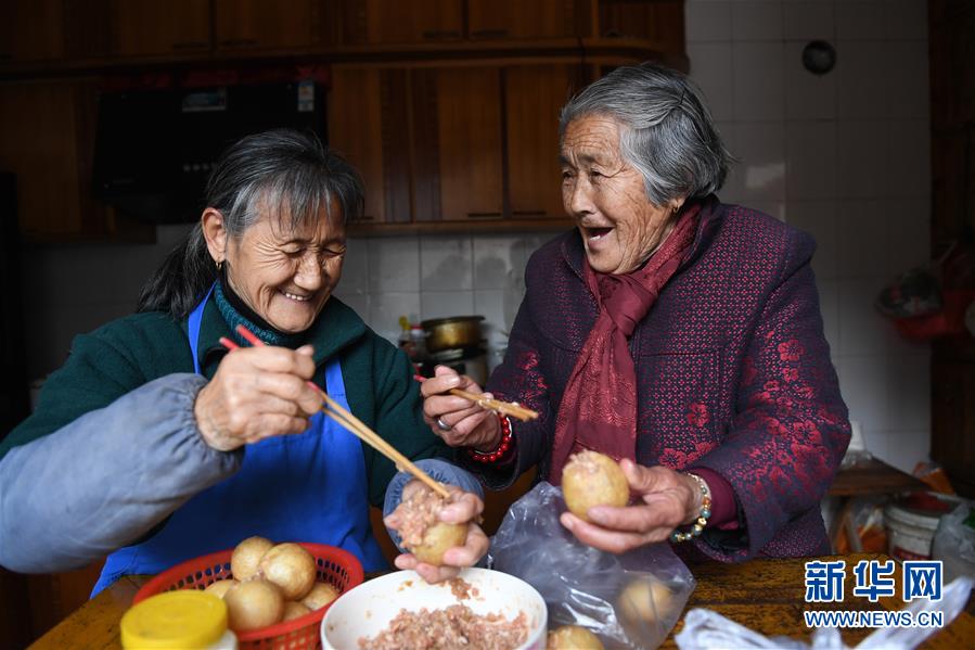 3月13日,顾彩夫(右)、陆引娣在一起准备饭菜。新华社记者 季春鹏 摄