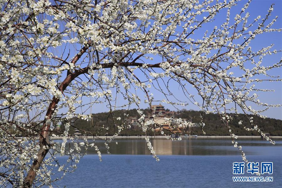3月13日,北京颐和园昆明湖西堤绽放的春花吸引了众多游人。 新华社发(刘宪国 摄)
