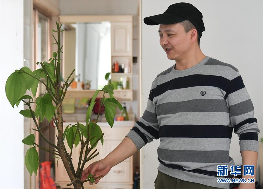 乌鲁木齐市天山区黑甲山片区阳光雅居居民马彦龙在新家整理盆栽(3月12日摄)。新华社记者 王菲 摄