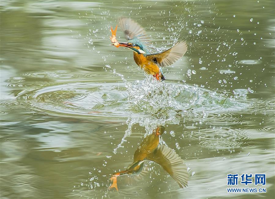3月13日,一只翠鸟在江苏无锡梅园的小池塘中捕食小鱼。 新华社发(潘正光 摄)