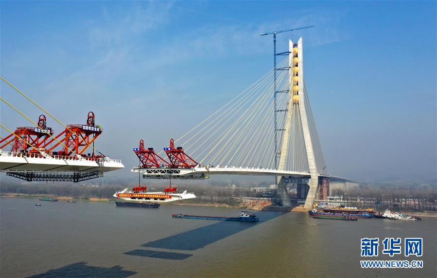 3月13日,在安徽池州长江公路大桥建设现场,中交二航局施工机械在吊装钢箱梁(无人机拍摄)。新华社发(过仕宁 摄)